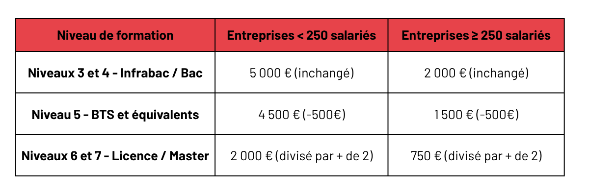• Modulation des aides selon la taille de l’entreprise (moins ou plus de 250 salariés) et le niveau de qualification visé par le contrat.